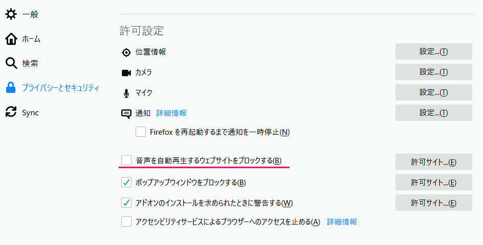 - 下の方にある「音声を自動再生するウェブサイトをブロックする」のチェックを解除する