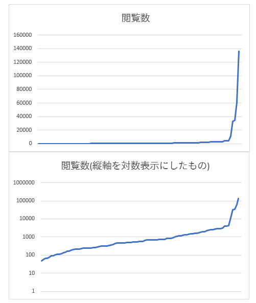 縦軸は閲覧数、横軸は100作品の中の相対順位。