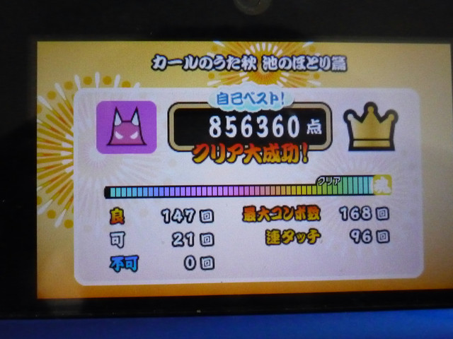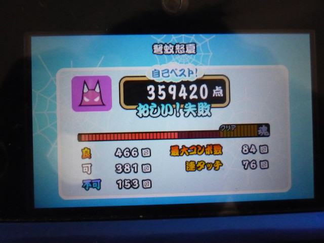 譜面も16分主体でそこまで複雑ではないものの、如何せん慣れていない3DSのボタンでのプレイは厳しい物がありました。