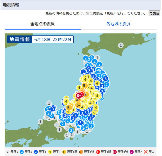 22:22頃、山形県沖を震源とする大きな地震が発生。