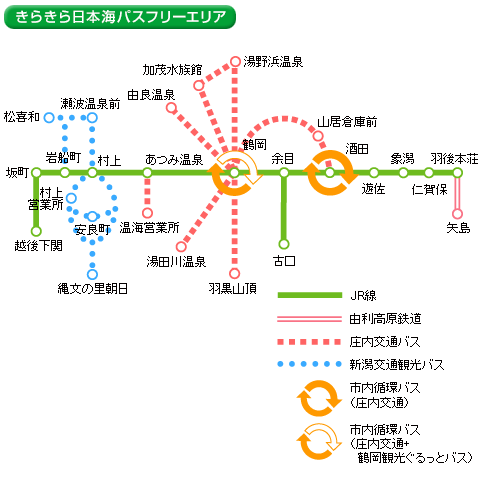 これは新潟県北部~庄内~秋田沿岸のエリアのJR線・3セク・バスに2日間乗り放題、