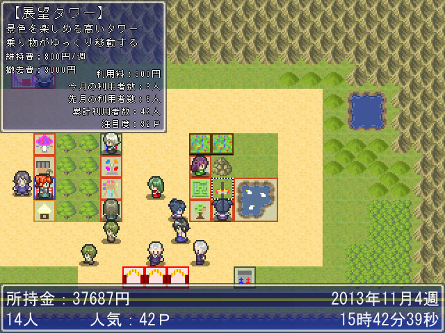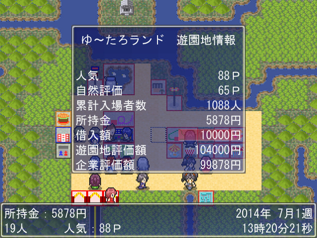人気や累計入場者数、評価額の他、この画面で借金も可能。