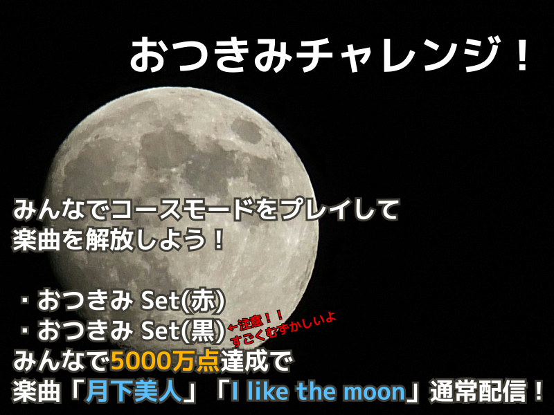 「おつきみ Set(赤)」「おつきみ Set(黒)」のみんなの総得点が5000万点突破で通常配信します。